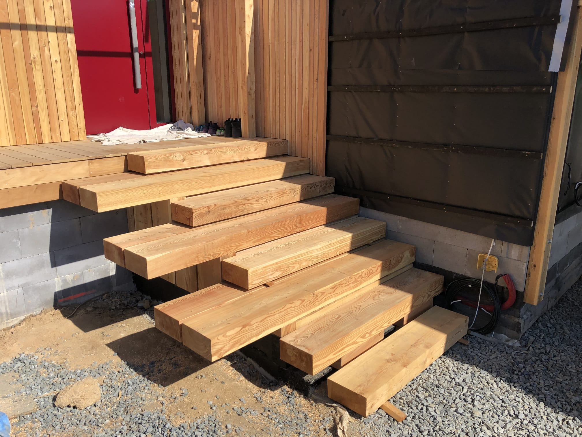 Nosný systém tvoří rám z opalovaných trámů, na který navazuje difuzně otevřená dřevěná konstrukce s foukanou izolací. Fasáda, terasy, schodiště i venkovní prvky jsou provedeny z modřínu, který sjednocuje vzhled celého domu. Projekt byl realizován jako stavba na klíč, včetně dodávky oken, dveří a podlah.