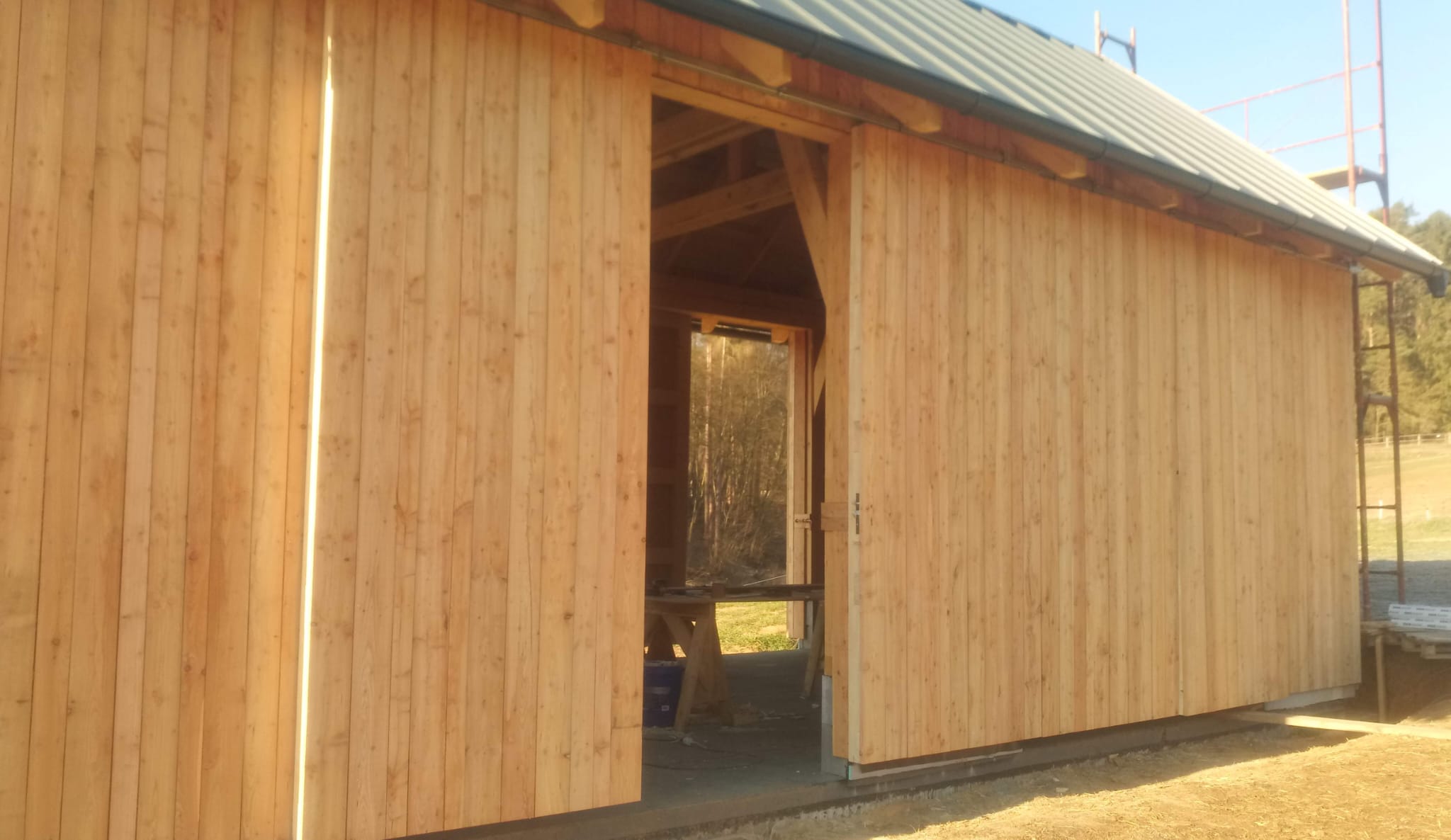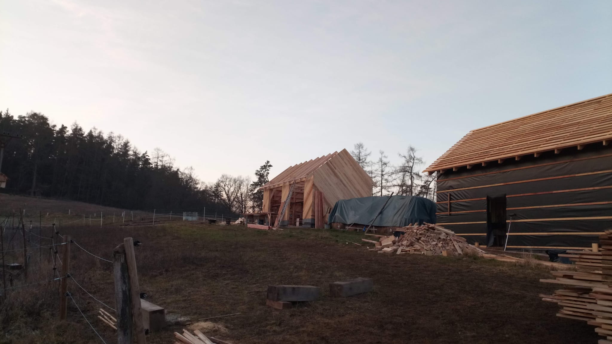 Nosná konstrukce je založena na vybetonovaných základových pasech a betonové desce. Stavby jsou obloženy modřínovým dřevem, které přirozeně stárne a dobře zapadá do okolní krajiny. Celé řešení klade důraz na odolnost, snadnou údržbu a praktické využití, ať už pro ustájení, skladování nebo technické zázemí provozu.
